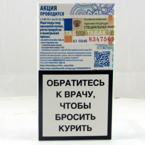 Kiss Russian Federation W1 12 Brand Family: Kiss Product Type: Cigarettes Country: Russian Federation City: Moscow Collection Date: September, 2013 Price: 37.00 RUB (1.10 USD) Stick count: 20 Noncompliant Health Warning Label: Not assessed *Selecting any of the linked attributes above will open a new search, showing all packs that match this attribute.