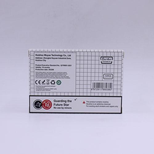 Binye China W3 07 Brand Family: Binye Product Type: E-cigarette disposable pod/cartridge Country: China City: Guangzhou Collection Date: May, 2023 Price: 99.00 CNY (14.36 USD) Features: Flavor Appeal Noncompliant Health Warning Label: Not assessed *Selecting any of the linked attributes above will open a new search, showing all packs that match this attribute.