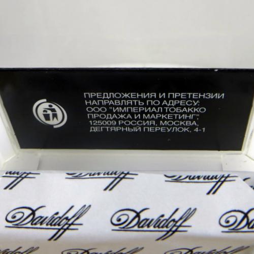 Davidoff Russian Federation W1 09 Brand Family: Davidoff Product Type: Cigarettes Country: Russian Federation City: Moscow Collection Date: September, 2013 Price: 63.00 RUB (1.88 USD) Stick count: 20 Noncompliant Health Warning Label: Not assessed *Selecting any of the linked attributes above will open a new search, showing all packs that match this attribute.